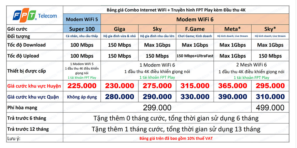 Lưu ý 1: Bảng giá gói cước Combo lắp mạng & Truyền hình FPT Play trọn gói đã bao gồm thuế VAT 10%.